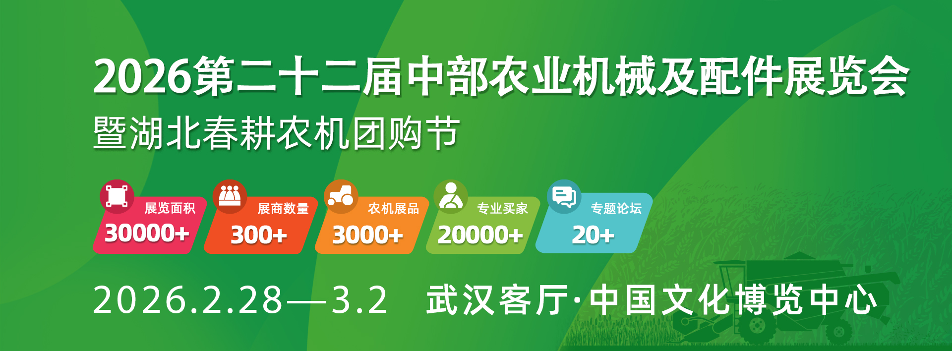 深入贯彻落实《中共中央 国务院关于进一步深化农村改革扎实推进乡村全面振兴的意见》全面实施农业农村部“智慧农业行动计划”,推动农机装备高质量发展,加快先进适用农机研发应用,老旧农机报废更新,发展智慧农业,拓展人工智能技术应用场景。以科技创新引领先进生产要素集聚,发展农业新质生产力2026第二十二届中部农业机械及配件展览会暨湖北春耕农机团购节定于2026年2月28日-3月2日在武汉客厅·中国文化博览中心举办。